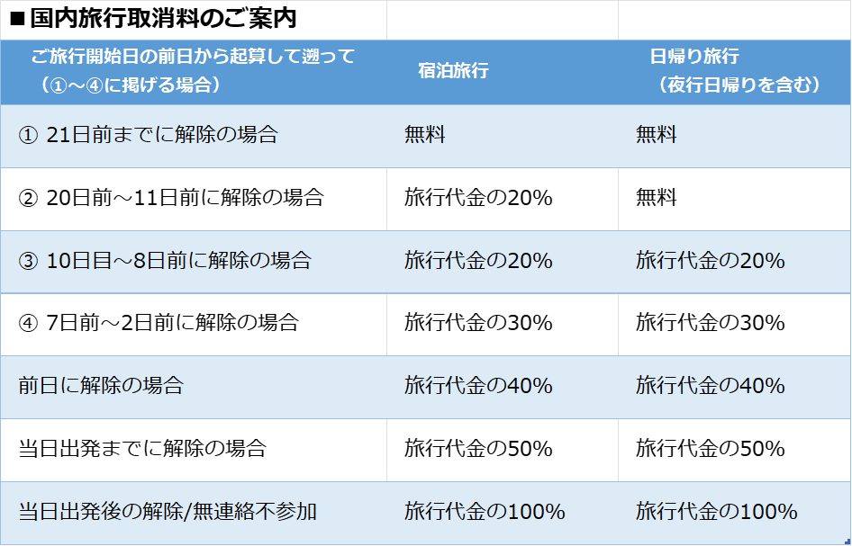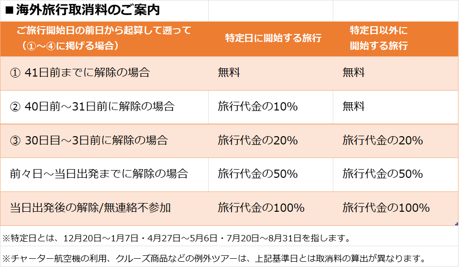 御予約のお取消には、下表のとおり所定の取消料が発生いたします。※チケットプラン・クルーズ等、一部例外ツアーを除く