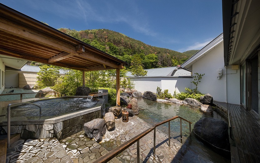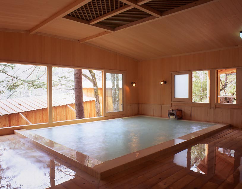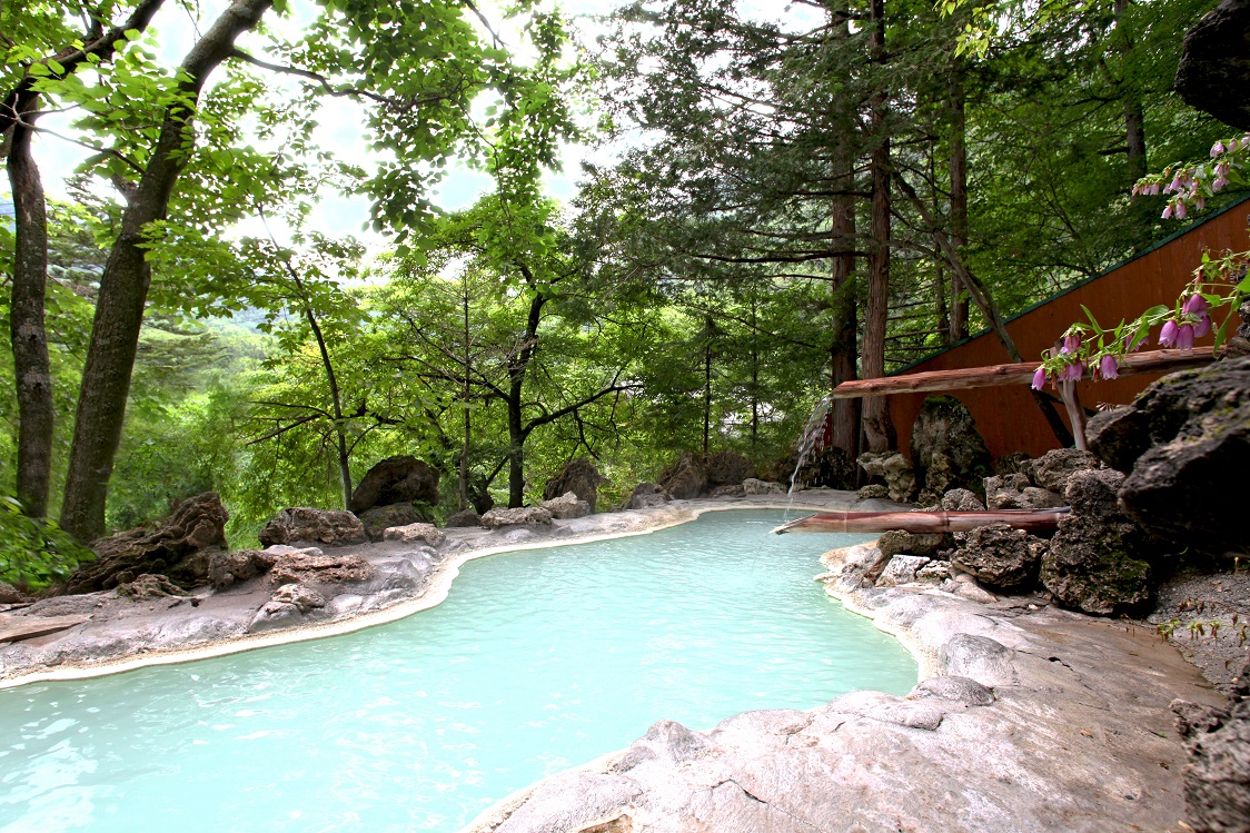 白骨温泉の高台に立地し、周囲は天然林に囲まれています。湯量豊富な敷地内に湧く自家源泉は、加温も加水もしていない極上の泉質をご堪能いただけます。