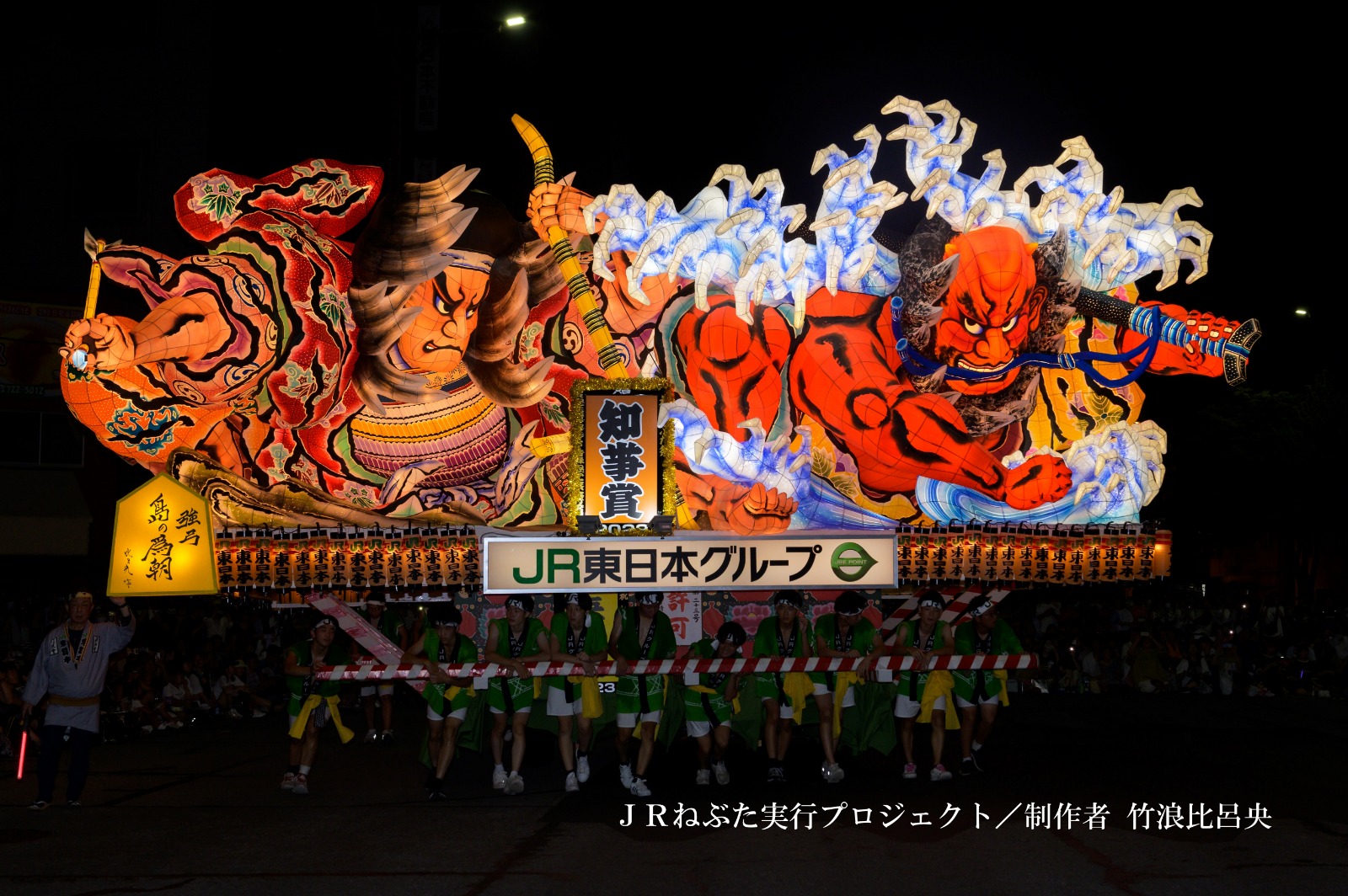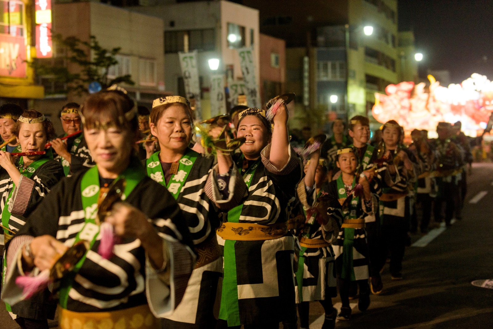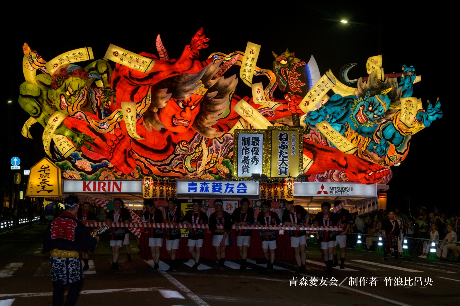 青森ねぶた祭り:東北三大祭りの1つで国の重要無形民俗文化財に指定されている「青森ねぶた祭」。「人形ねぶた」と呼ばれる、神話などを題材に木と針金を骨組みとした和紙製の色鮮やかな巨大灯ろう「ねぶた」を載せた山車に続き、「跳人(ハネト)」と呼ばれる踊り子たちが「ラッセラー、ラッセラー」と掛け声を上げながら踊り歩きます。