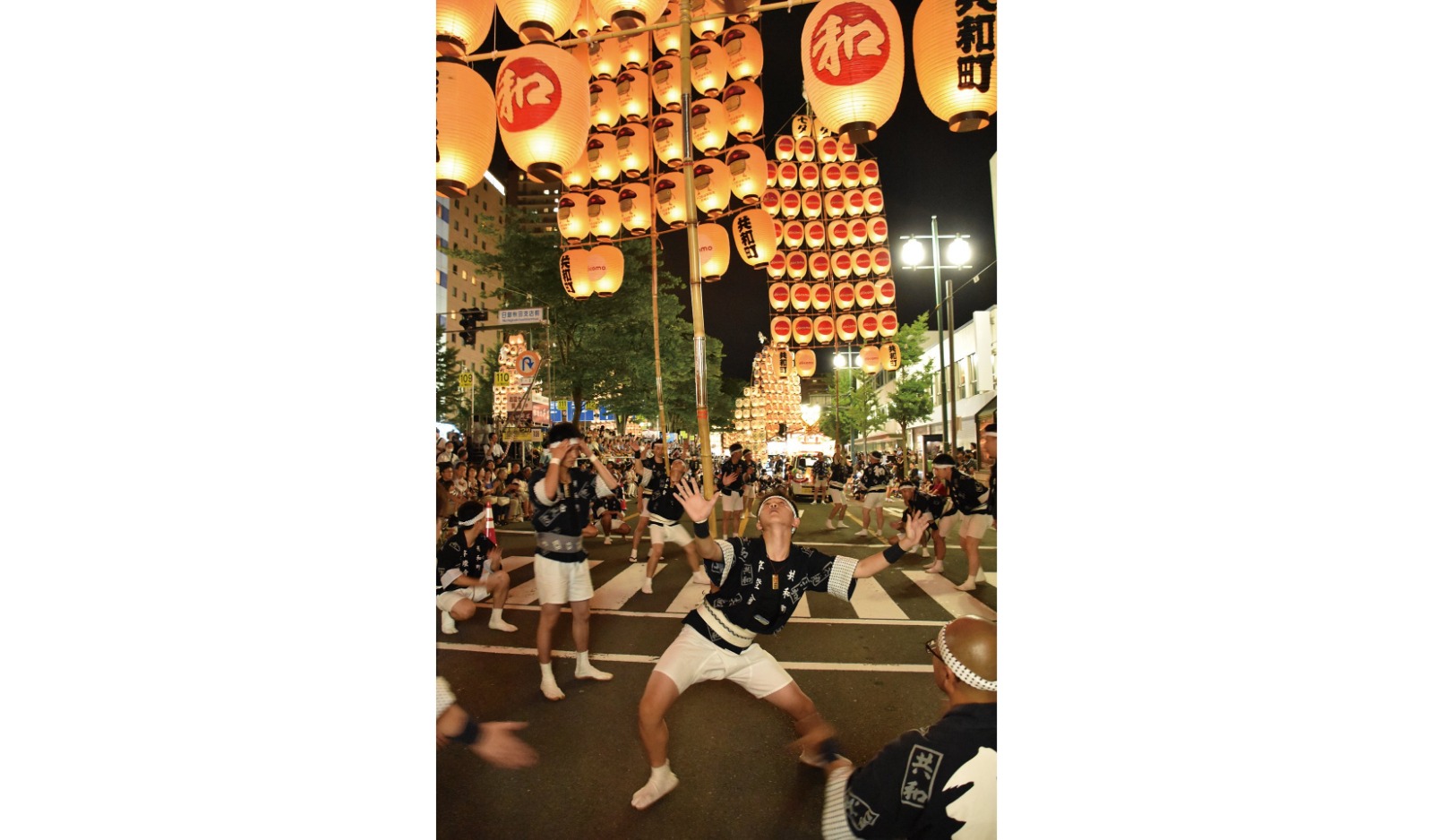 秋田竿燈まつり:国重要無形民俗文化財に指定され、東北三大まつりのひとつにも数えられている「秋田竿燈まつり」。提灯を揺らめかせ、稲穂に見立てた竿燈を操りながら力と技を競います。「ドッコイショー、ドッコイショー」の掛け声が響くなか、差し手たちは大きな竿燈を手のひら、額、肩、腰へと自在に操る姿は、まさに職人芸。